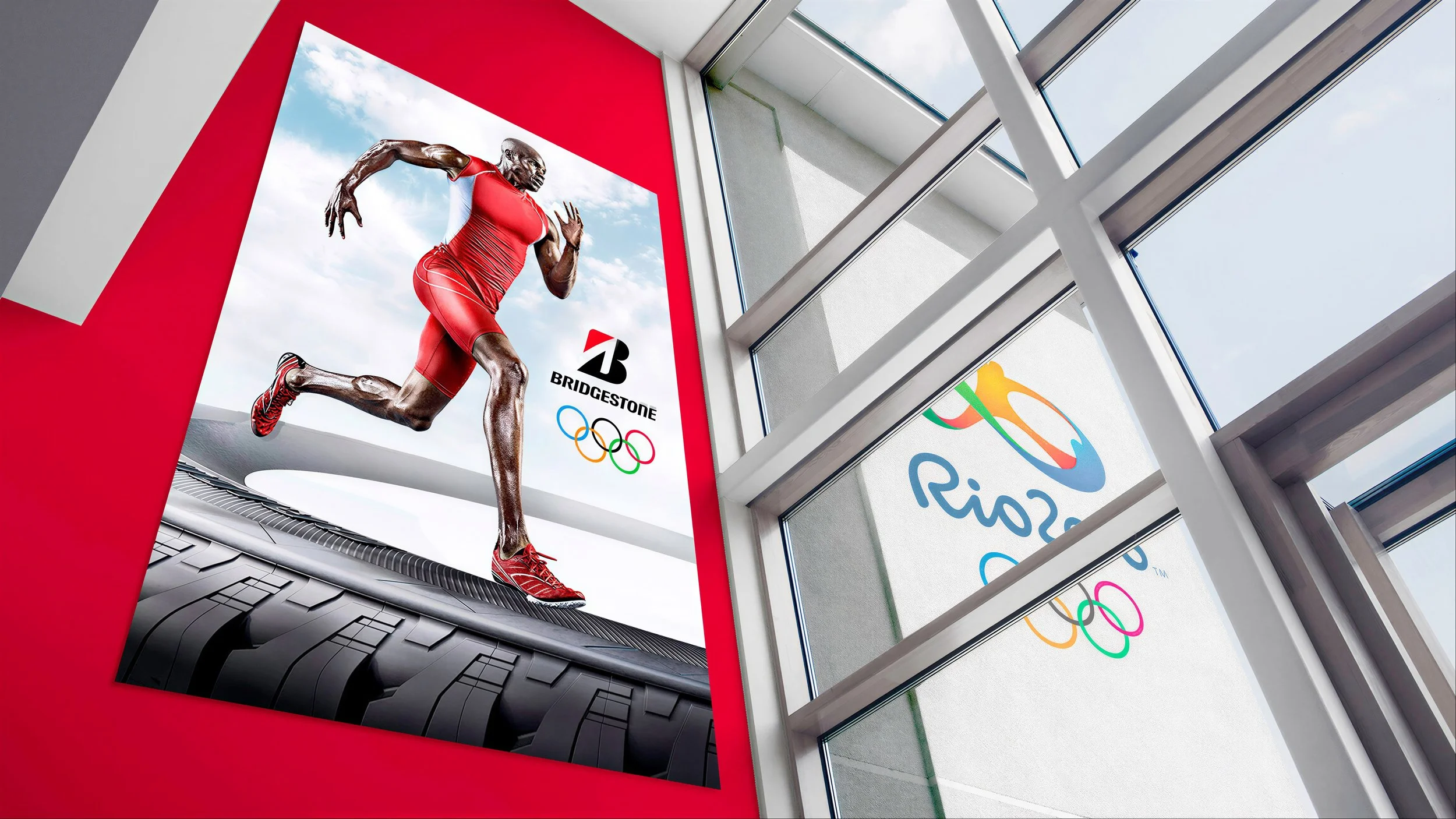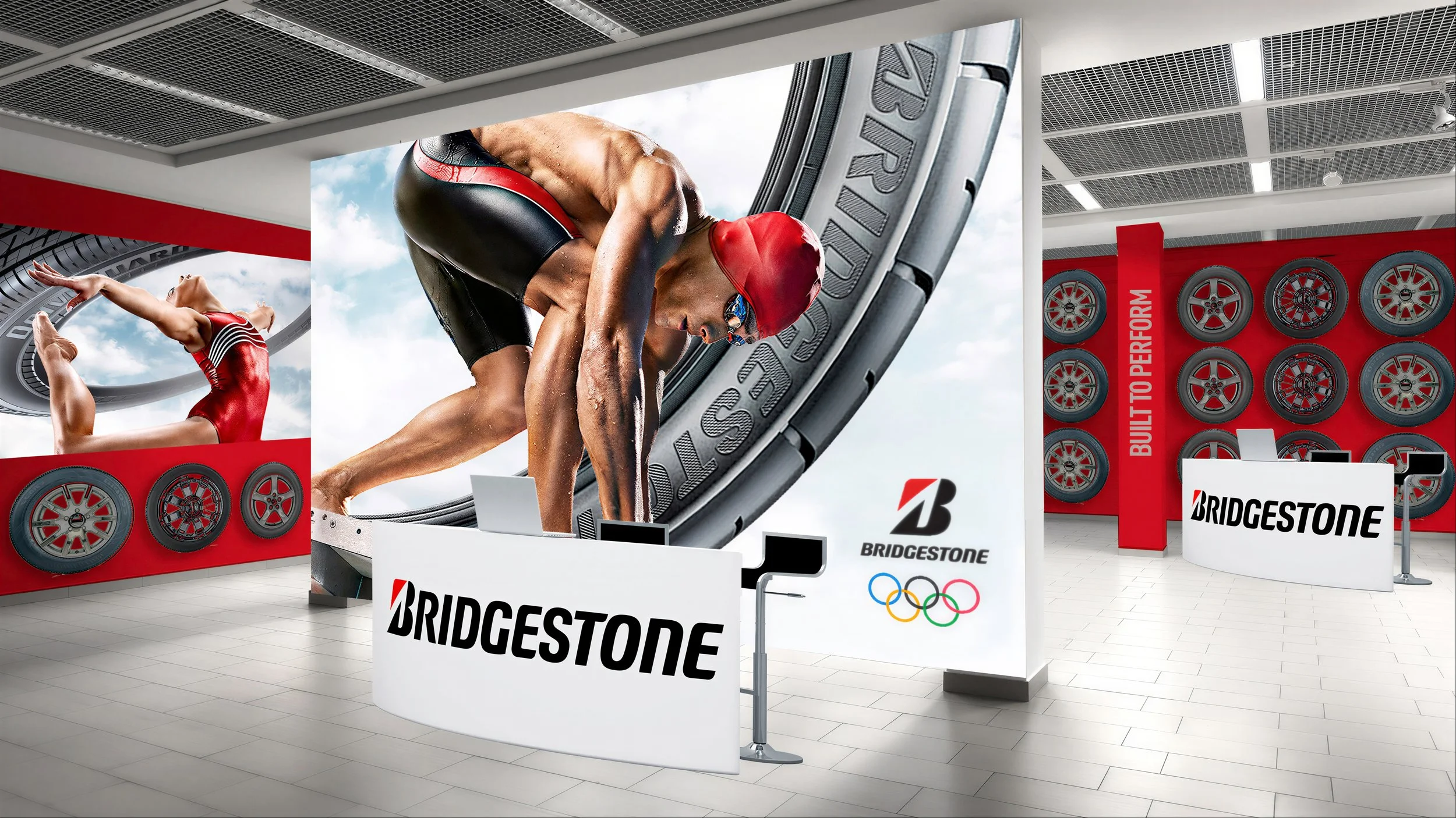 We designed the complete retail experience for Bridgestone's Summer Olympics activation, from in-store signage and point-of-sale displays to dealer kits that made every location feel like part of the Games.