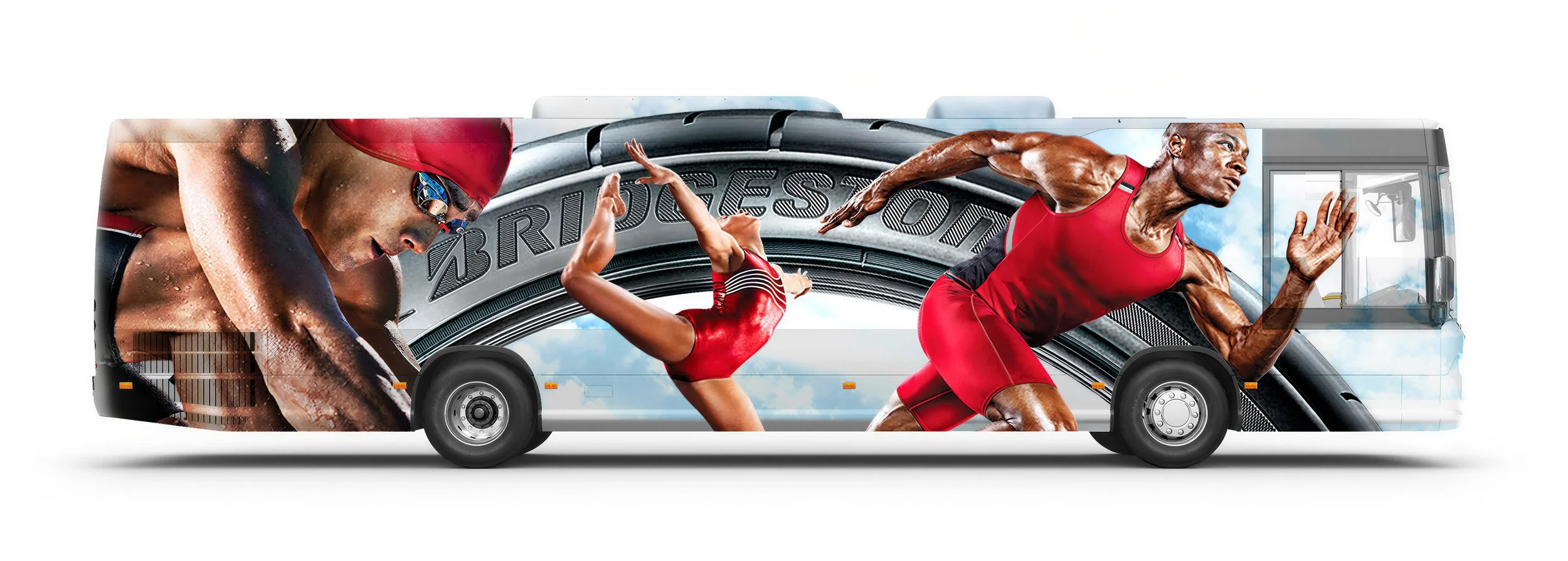 The campaign extended beyond retail into the Olympic Village itself, with full bus wraps and venue signage that put the Bridgestone brand alongside the athletes on the world's biggest stage.