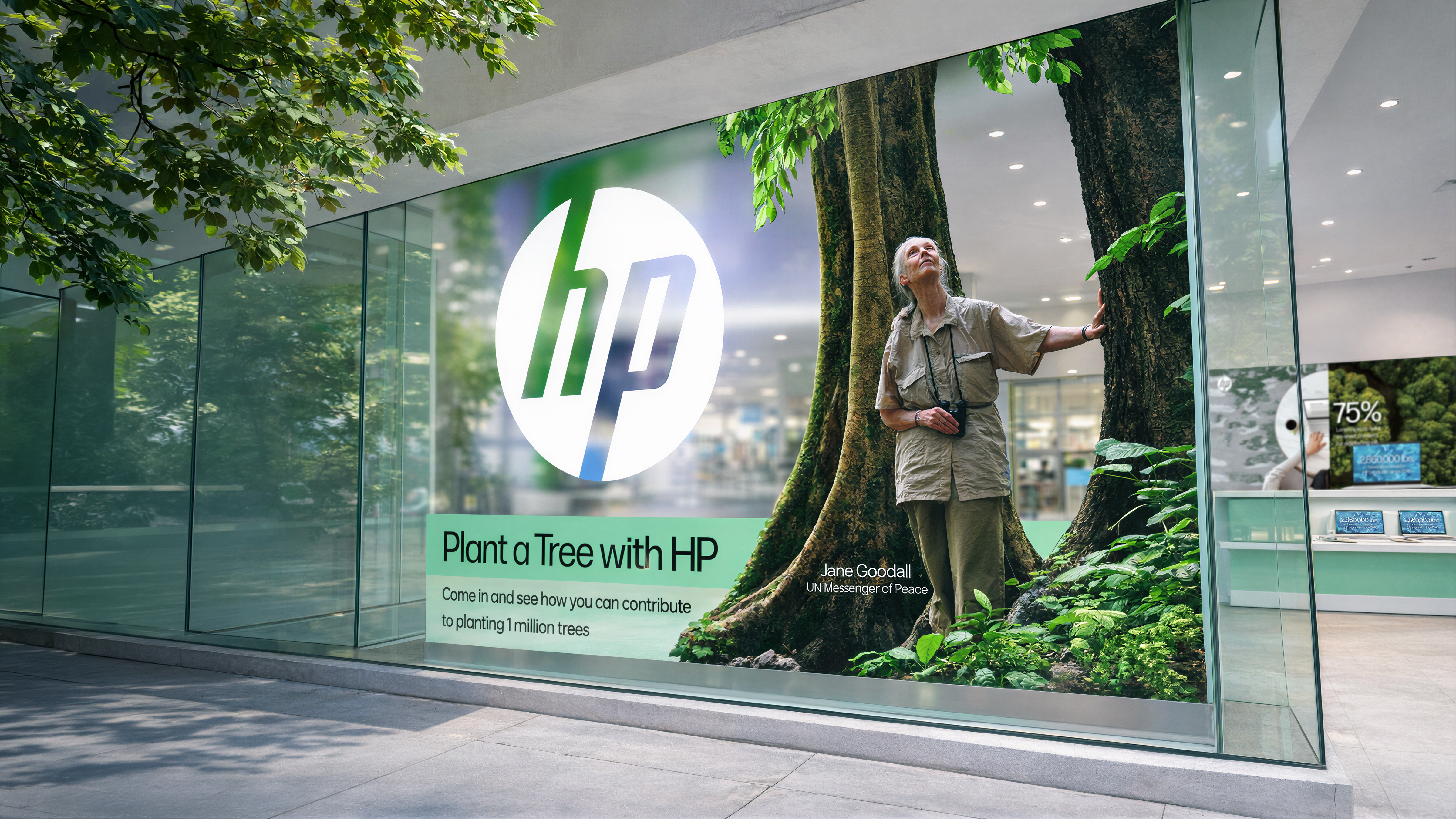 HP partnered with Jane Goodall to give shoppers a reason to care about a printer purchase. The message was simple: buy one, plant one. We took it to scale across 9,500+ retail store activations, in-store TV wall takeovers at Walmart, Costco, Best Buy and beyond, 729,000+ Amazon product page views. The campaign extended to pop-up stores bringing the forest into the heart of retail. Rebel Wilson carried the message across social. CNN picked it up. Ad Age covered it.